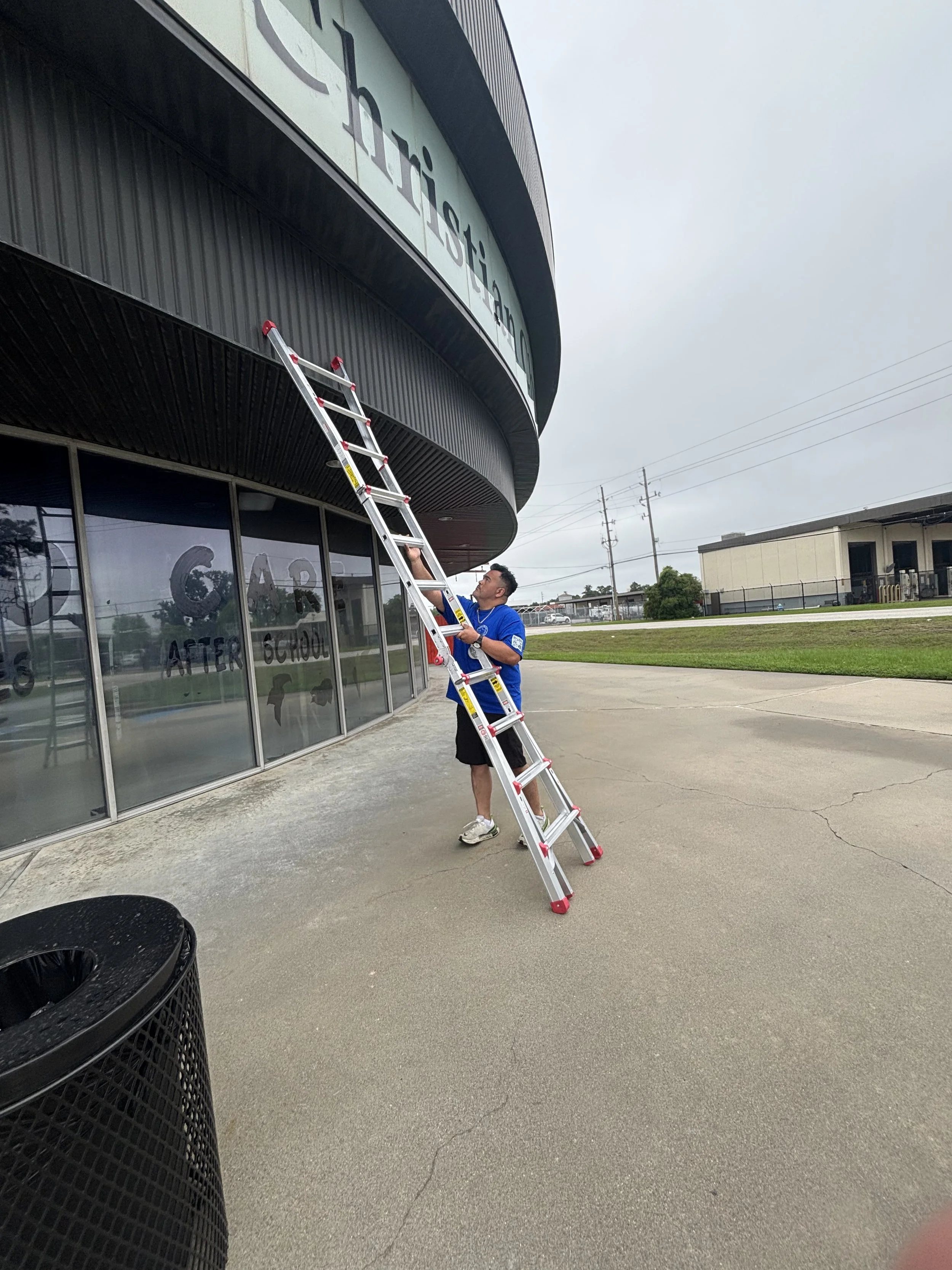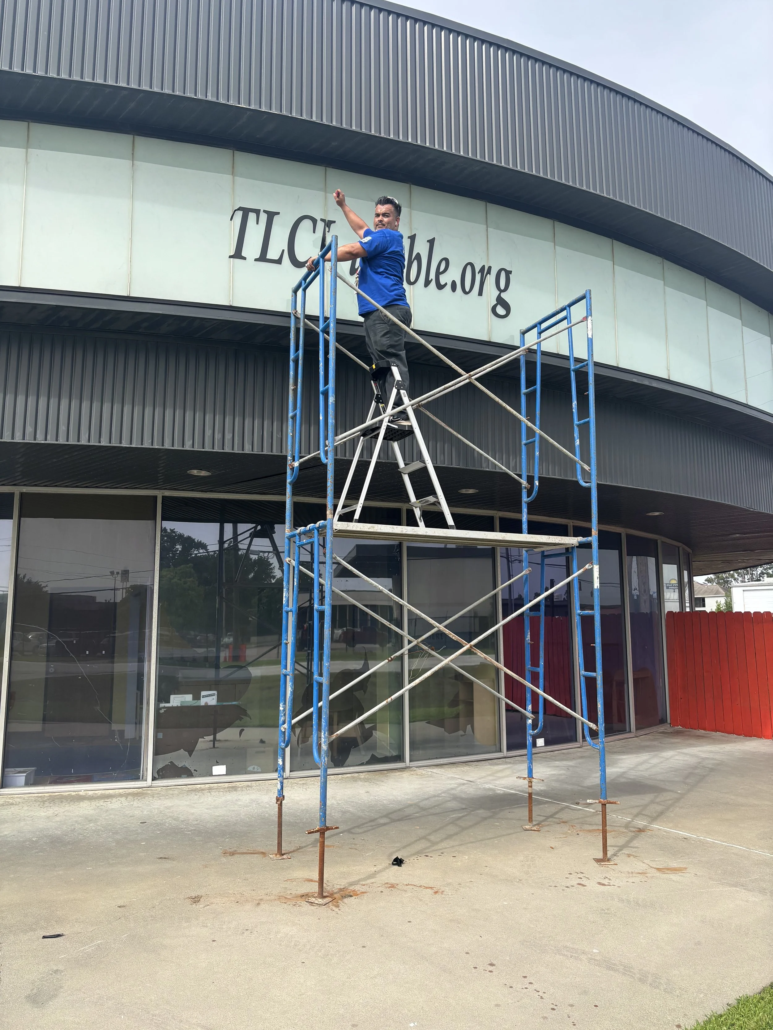 We have been working to try and remove signage from the previous company! First, we tried a scraper on an extension pole…not long enough to reach the letters, then a ladder with the scraper, but the ladder was too short and wobbly, now scaffolding for the WIN!!!!