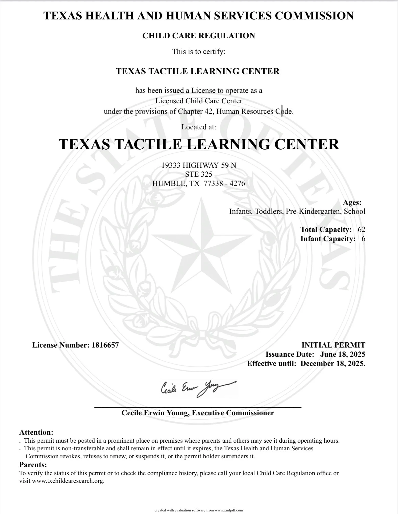 The initial permit will show you our operation number, licensed capacity, and age groups we serve. There is a copy posted in the lobby for viewing.